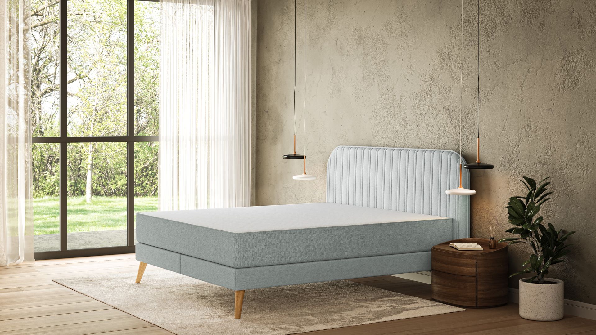 Nahaufnahme des hellbeigen, stoffbezogenen Boxspring-Unterbaus mit Stützfüßen, im Schlafzimmer mit Polster am Kopfteil.